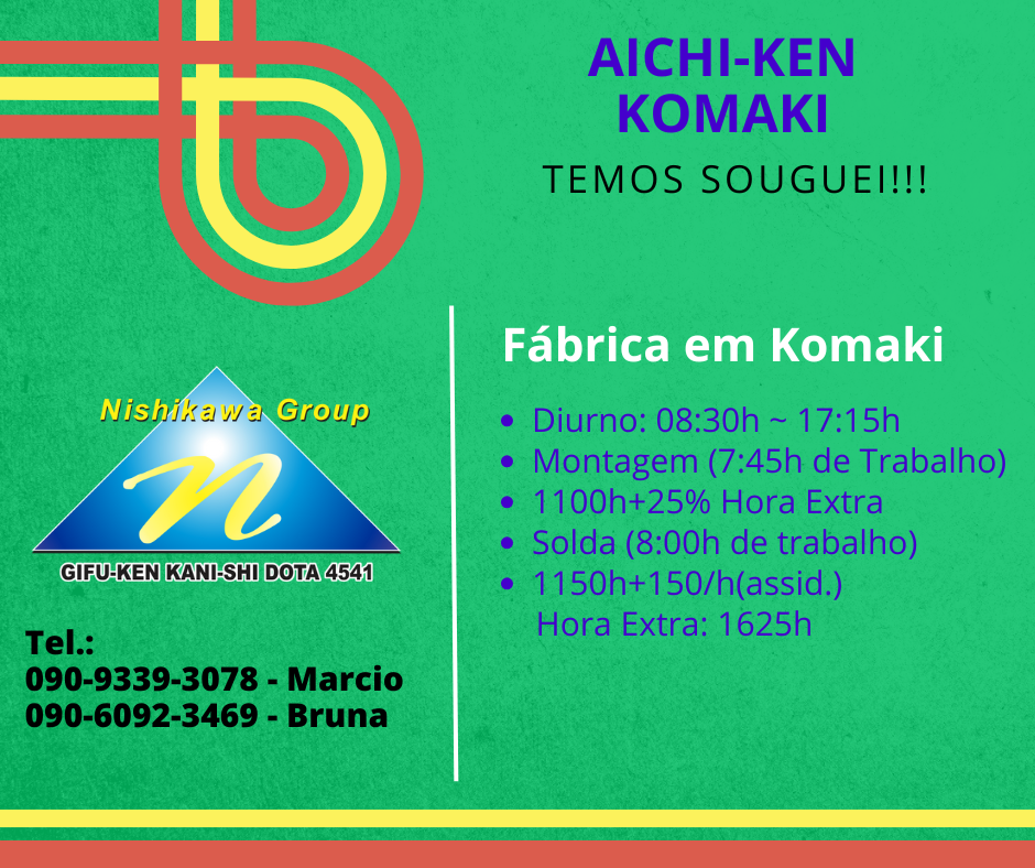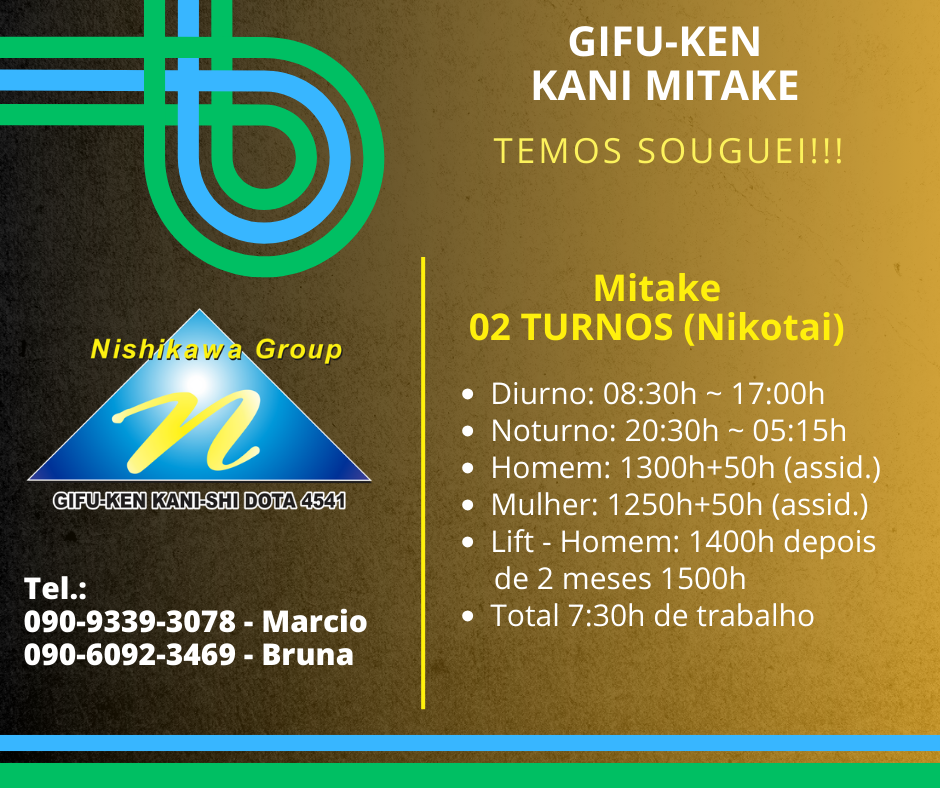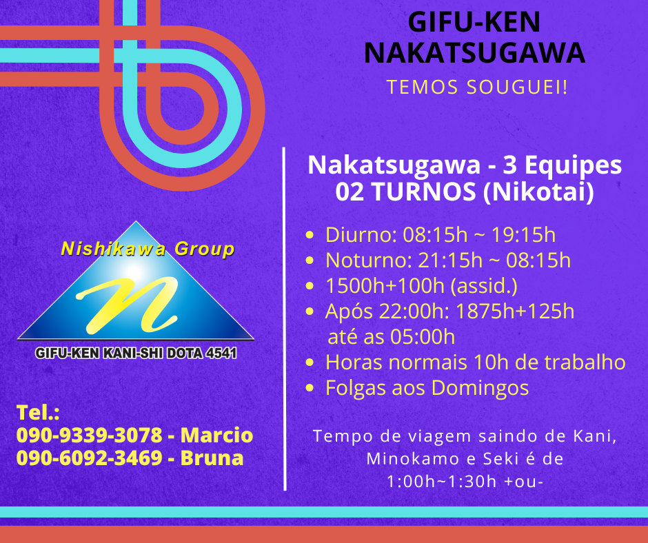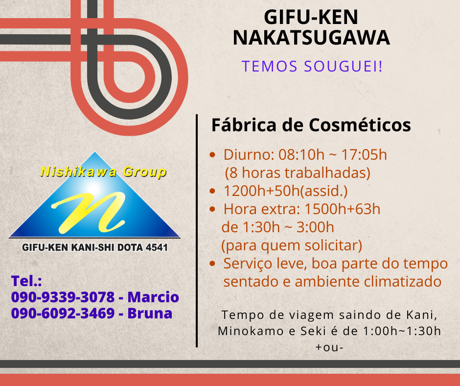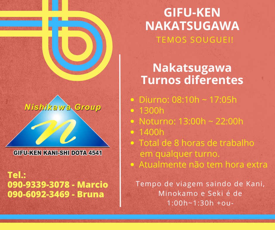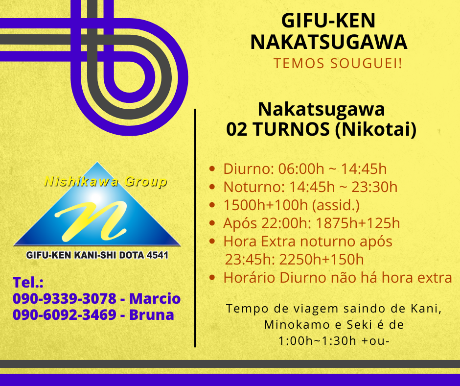 Salário: ¥1.400/h depois de 02 meses ¥1.500/h